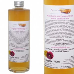This is a vinegar rinse made from natural apple cider vinegar and a combination of herbs and essential oils to help brighten white and light blonde hair. It contains blue malva flower and lemon to cleanse your hair and remove yellow tones and restore your natural brightness. Spray in your hair after washing and distribute....